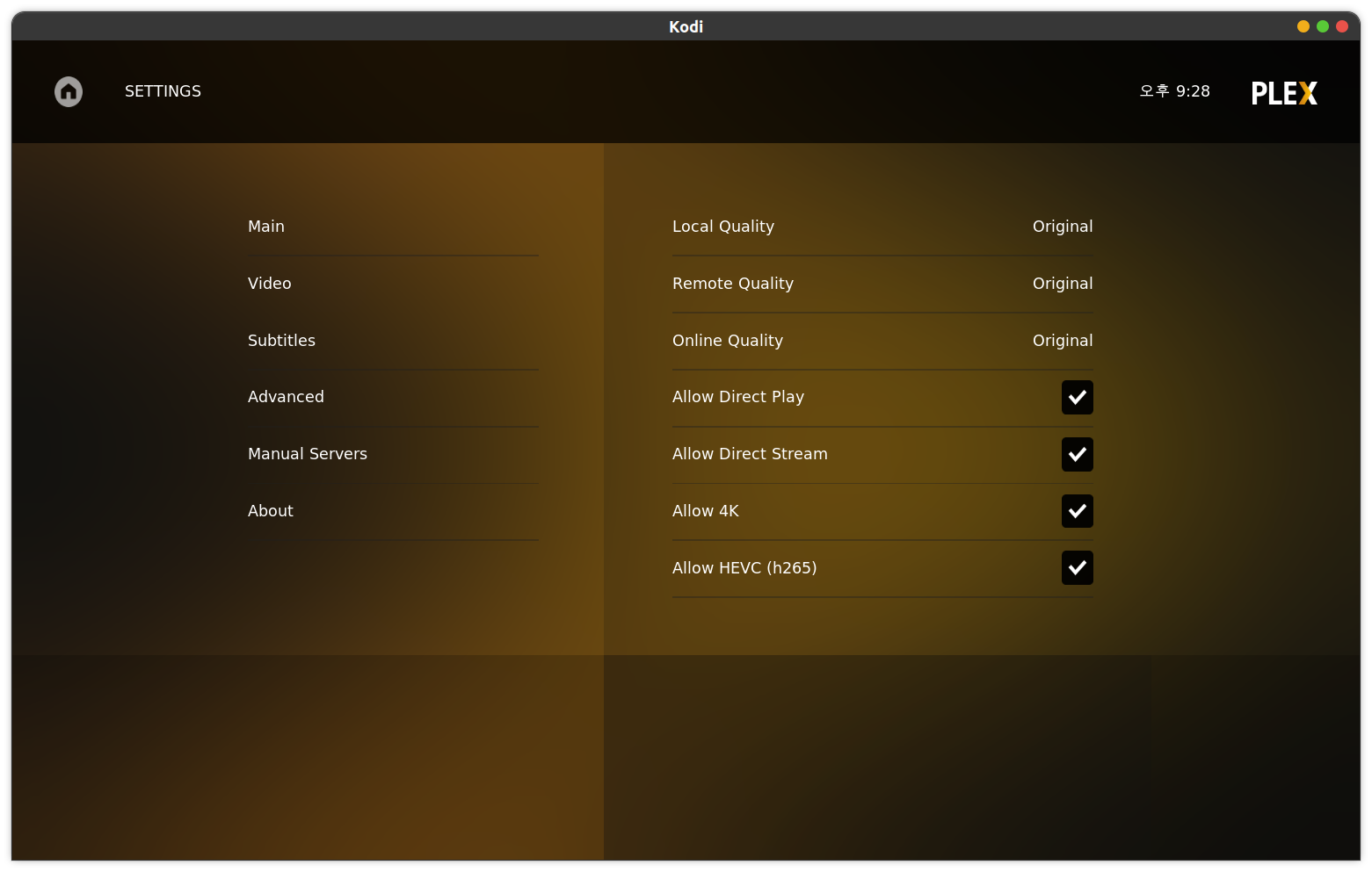 애드온 - 다운로드 - 비디오 애드온 순서로 들어가면 설치할 수 있다. 코디 인터페이스를 유지하면서 플렉스와 연동이 되지만 파일을 불러오는 경로가 다소 복잡해지기 때문에 PKC(PlexKodiConnect)를 좀 더 추천한다.
