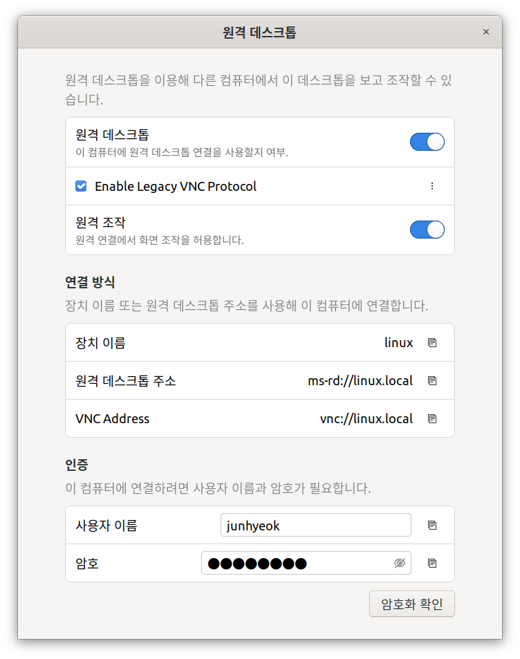 이전 버전에서는 우분투에서 Windows로 RDP 접속이 가능하고 Windows에서 우분투로 접속할 때는 VNC만 가능했는데 이제는 양방향으로 RDP, VNC 모두 지원된다. 우분투로 VNC 접속을 위해서는 Enable Legacy VNC Protocol 옵션에 체크를 해주어야 한다.